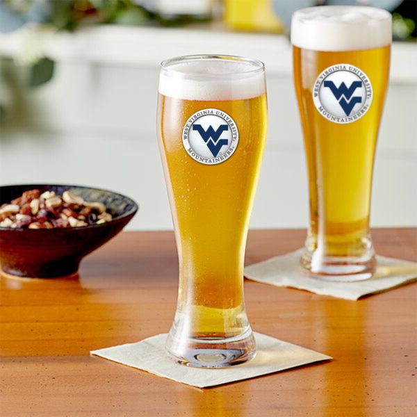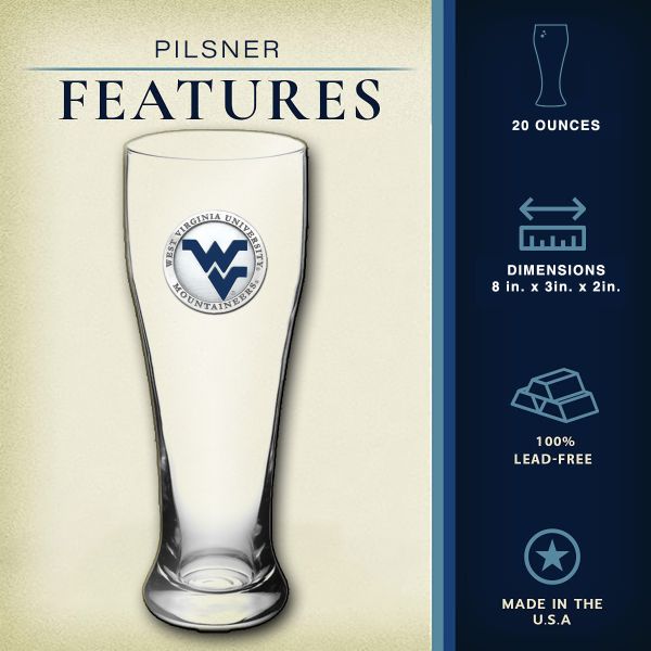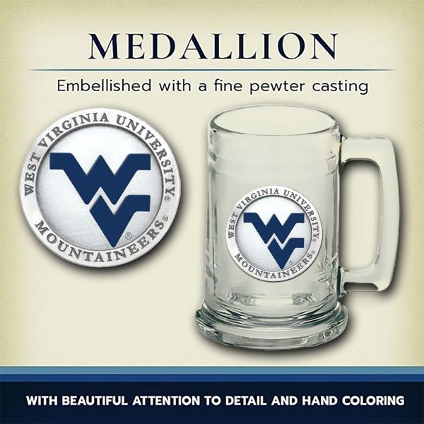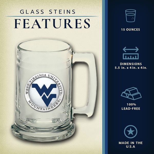 The Beer Chest Set comes with 2 - 20oz glass pilsners and 2 - 15oz glass steins. Each have a pewter medallion of your favorite NCAA team embellished to it.